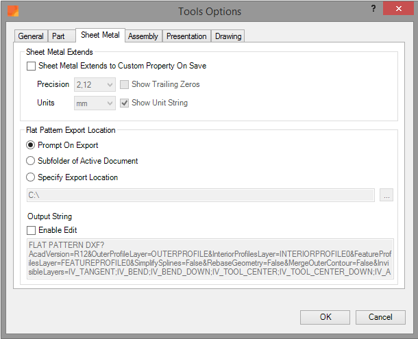 Specifies how the flat patterns will be exported. By enabling the checkmark the 'Output String' can be manually changed. It is recommended to first copy the existing string, using CTRL-C, to a text file. In which you can modify the string. After performing the changes, you can copy the new string back into the 'Output String' text field.